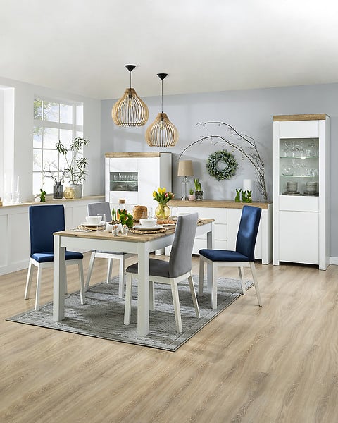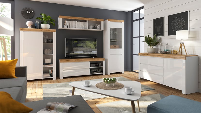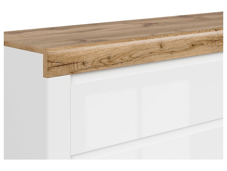 Die Mattweiße Korpusfarbe harmoniert perfekt mit den hochglänzend weißen Fronten, während die Tischplatte in Wotaneiche mit ihrer ausgeprägten Maserung das Möbelstück zu einem echten Hingucker macht. Beachten Sie bitte, dass durch die verschiedenen Materialien der Arbeitsplatte und Leisten leichte Nuancenunterschiede in der Maserung auftreten können.