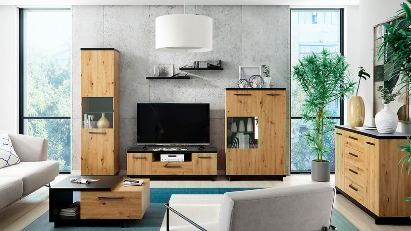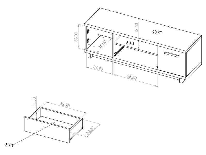 TV-Schrank Ines kombiniert stilvolles Design mit praktischer Funktionalität. Mit einer stabilen Basis und einer ausdrucksstarken, schwarzen Tischplatte fügt sich der Schrank perfekt in verschiedene Einrichtungsstile ein. Zwei geräumige Fächer bieten viel Platz für elektronische Geräte und Zubehör. Die Schubladen gleiten dank Rollenführungen leise und sanft. Die schwarzen Griffe verleihen dem Möbelstück einen minimalistischen Akzent. Die Laminatoberfläche sorgt für einfache Reinigung und Kratzfestigkeit.