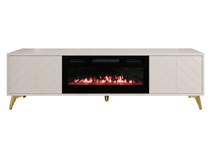 Dieser elegante TV-Schrank bietet nicht nur großzügigen Stauraum, sondern beeindruckt mit einem integrierten elektrischen Kamin. Das stilvolle Design mit goldenen Metallbeinen und „PUSH TO OPEN“-Fronten passt perfekt in moderne Wohnräume.