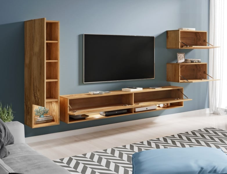 Die Wohnwand AMY kombiniert modernes Design mit hoher Funktionalität. Die warme Wotaneiche-Farbe sorgt für eine gemütliche Atmosphäre, während die optionale LED-Beleuchtung das Set stilvoll in Szene setzt.