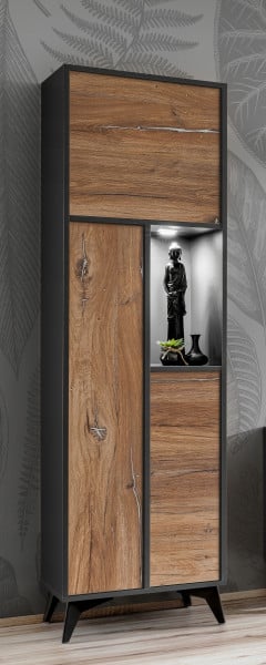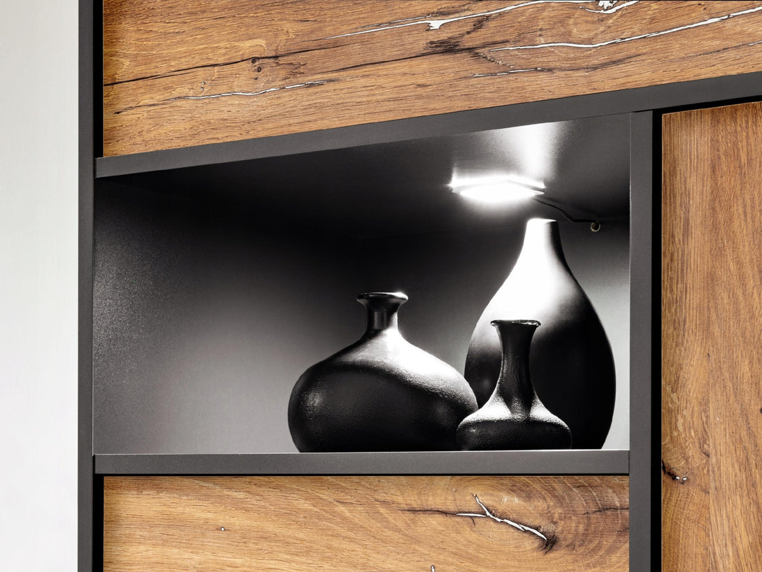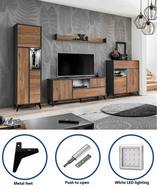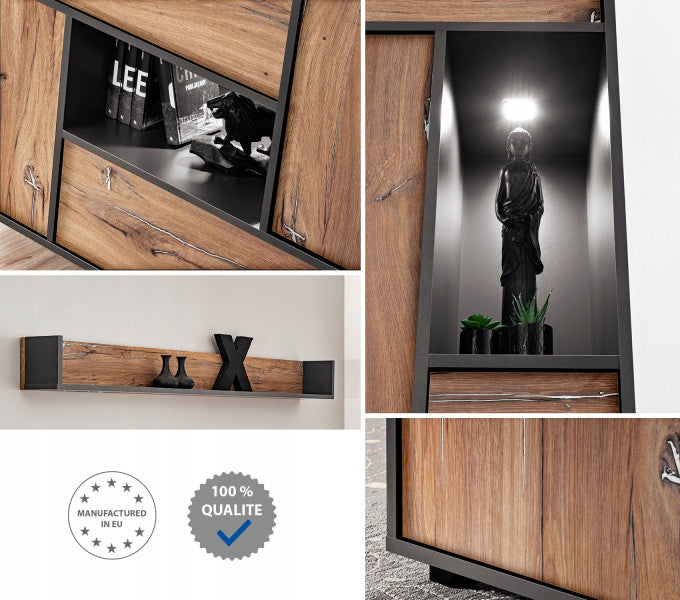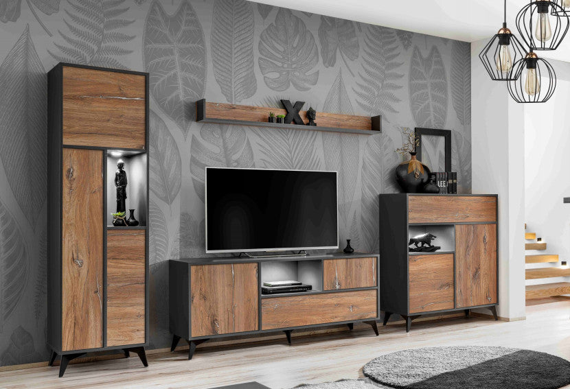 Das Set ist sowohl als Komplettlösung als auch einzeln erhältlich, sodass Sie flexibel Ihre Möbelwahl treffen können. Die Möbel sind ideal für industrielle, rustikale oder eklektische Wohnstile. LED-Beleuchtung auf speziellen Regalen macht das Set besonders attraktiv.