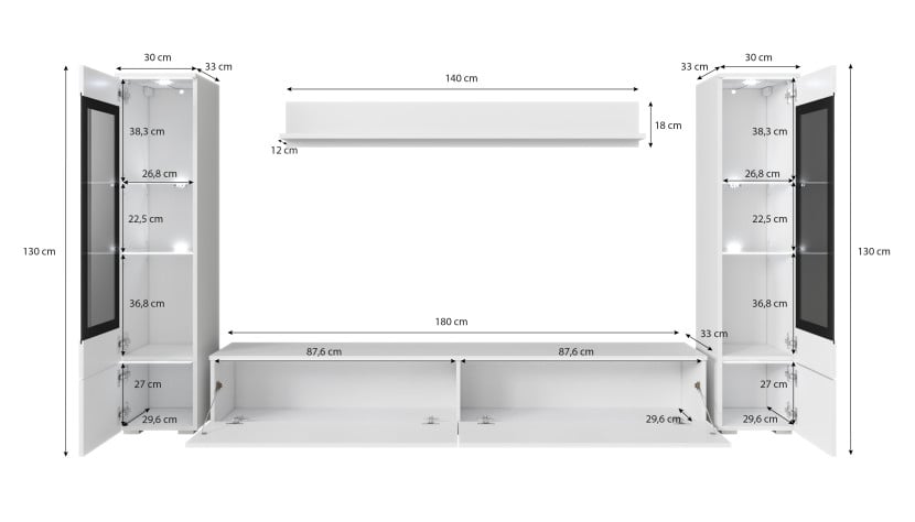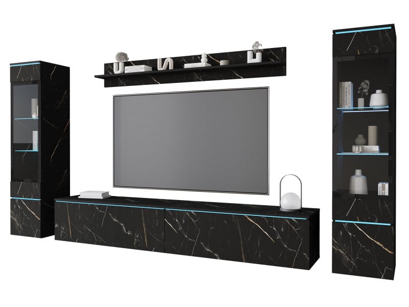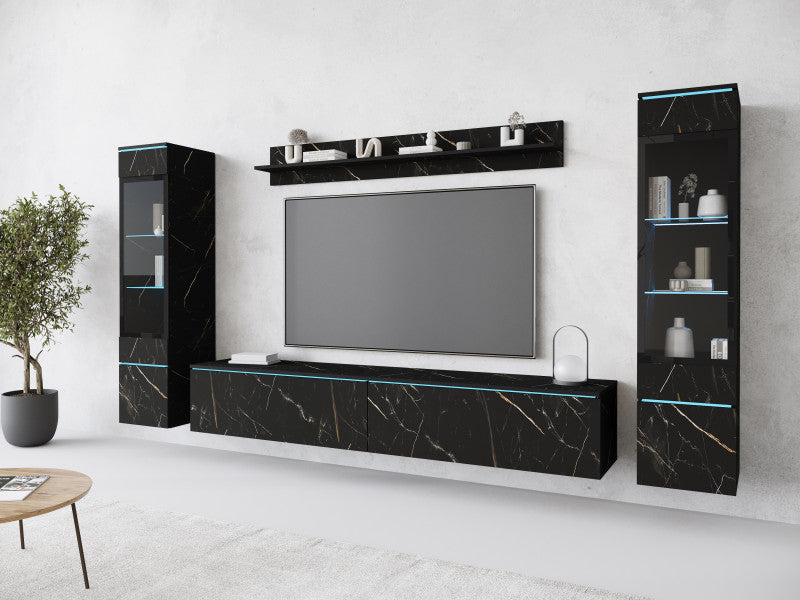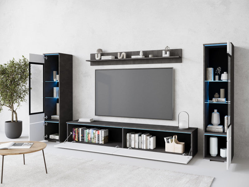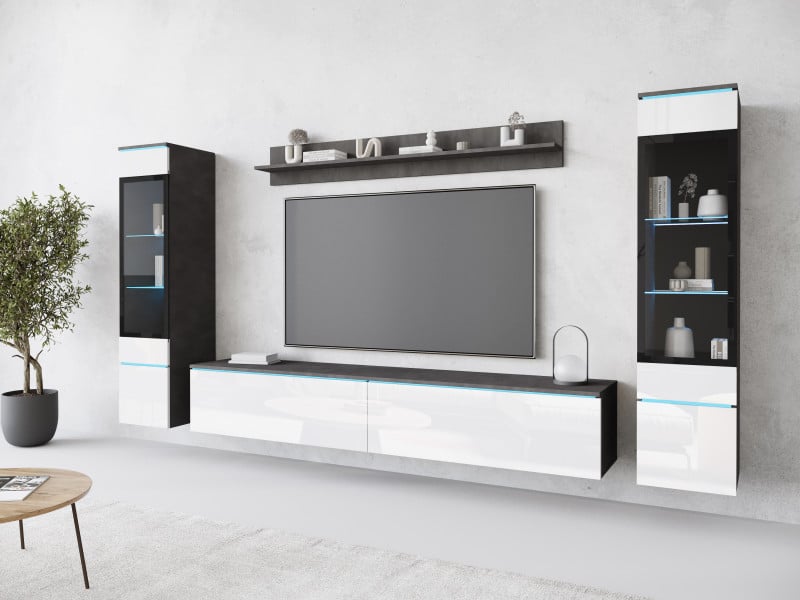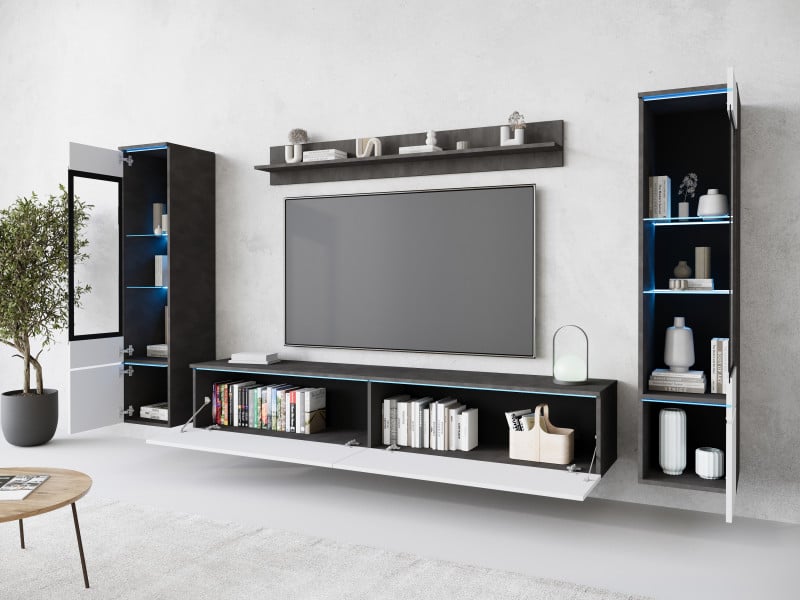 Die Wohnwand VEVE 2 vereint modernes Design mit praktischer Funktionalität. Ob hängend oder stehend – sie passt sich flexibel Ihren Bedürfnissen an und ist perfekt für kleine Räume geeignet. Die integrierte LED-Beleuchtung hebt Ihre Lieblingsdeko hervor und verleiht dem Raum eine stilvolle Atmosphäre.